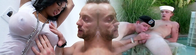Ava Koxxx with Leigh Darby providing Sam Bourne super-steamy blowjob in ffm porn