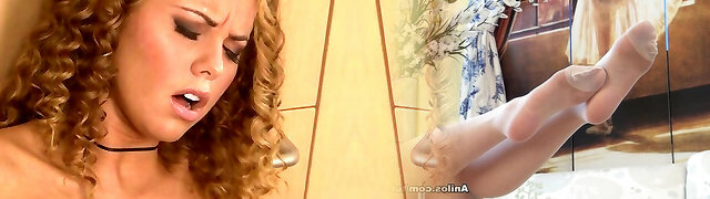 Steamy girl in colorful stockings Aria Banks kneels down to give nice head