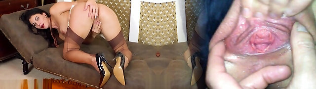 Busty brown-haired wanks off in vintage nylons garters stilettos