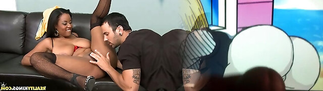 Luxurious black chick gets her hands on a white dick