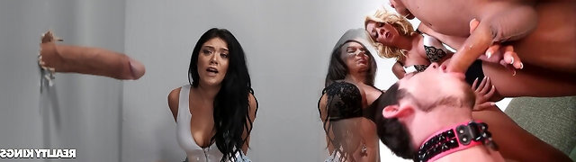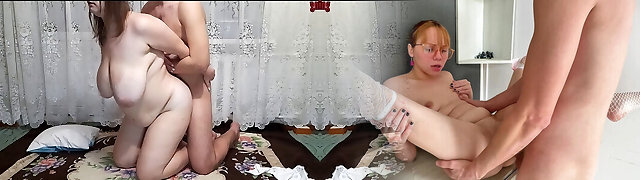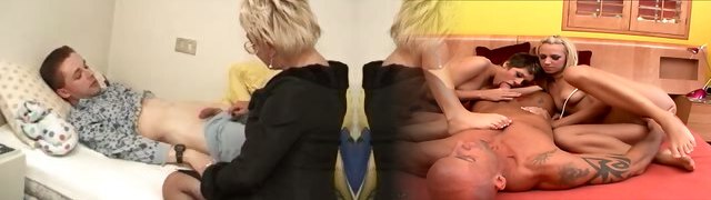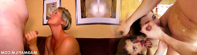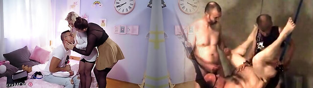 Mommy and her obese girlfriend fuck stepson without mercy