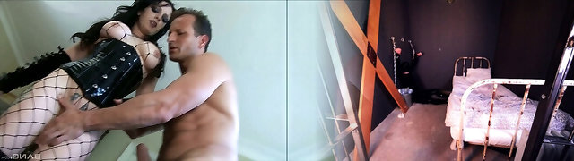 Brunette woman in fishnets gives a titjob and sucks a fuckpole