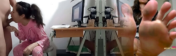 Office threesome with babes who are well-prepped to suck the dick