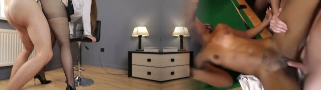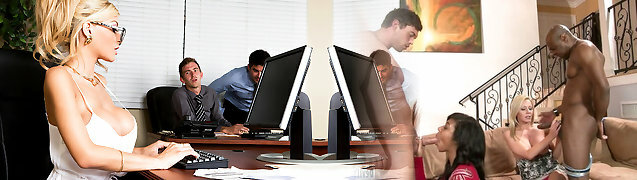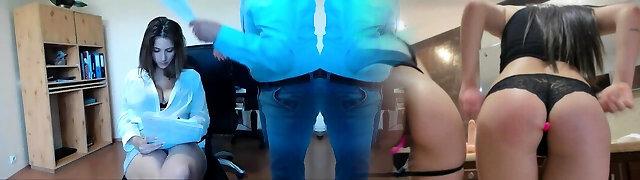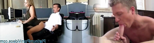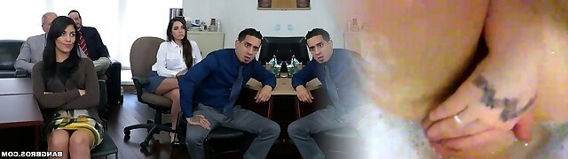 Two co-employees analyze one busty secretary in stockings