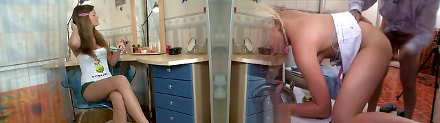 Brunette teen puts on her best pantyhose and lingerie to please two horny guys