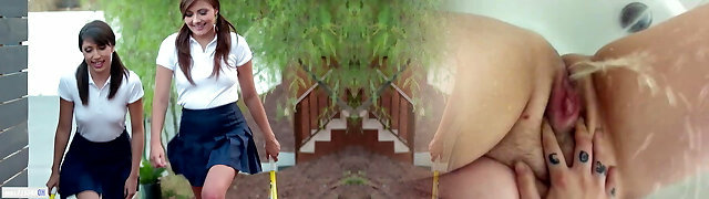 Naughty school doll sucking g/g mommys sexy boobs