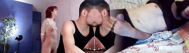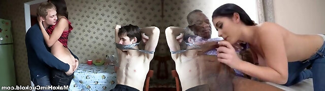 Gagged and corded up cuckold BF watches naughty teen riding best friend