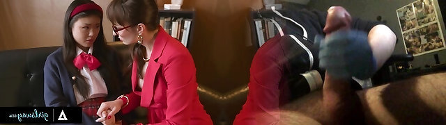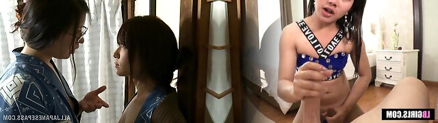 MILF with huge milky tits plays with Asian students in girly-girl threesome