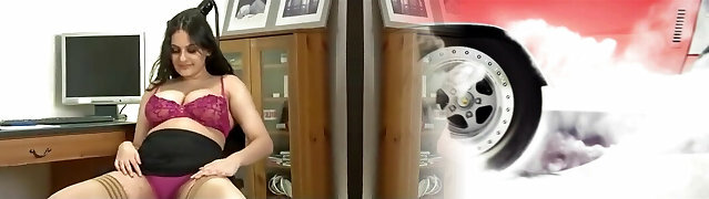Brunette plump teen Margo wearing sexy undergarments masturbates in her bed