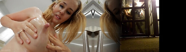 Solo blonde model Aali oils up her huge tits and erect puffies