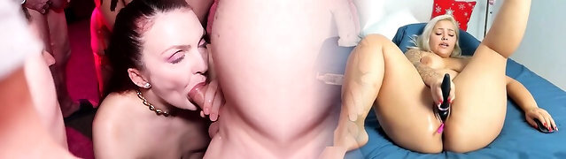 Magnificent German ladies pleasing a big group of cocks