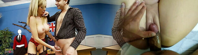 This busty blonde milf with perfect fake jugs is really into big guns and is taking one hard