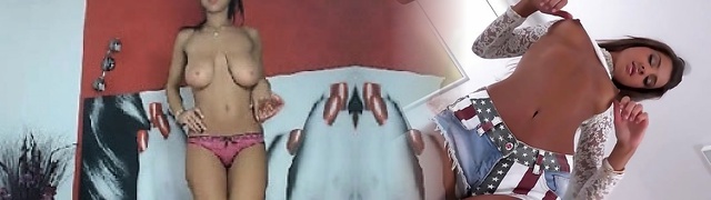 Blue eyed brunette shows her jugs