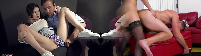 Naughty coed chick Josie Jagger sits onto educator's laps and tempts him for sex
