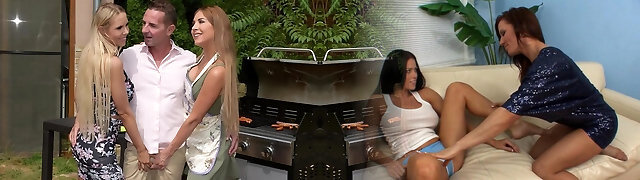 Grill party with a lonely neighbor and a pervy duo ended with anal sex and facial cumshot