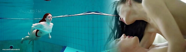 Nice chick Katrin Bulbul swims and flashes her pierced stiff nipples