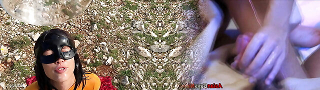Close Up View Of Good-sized Tit Black-haired Peeing In The Bushes