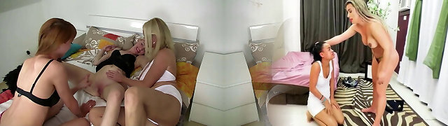 Busty step-mother and skinny stepdaughter share duo of dicks in bed