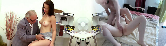Ugly old man polishes and fucks teenage pussy of uber-sexy brunette