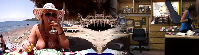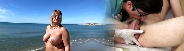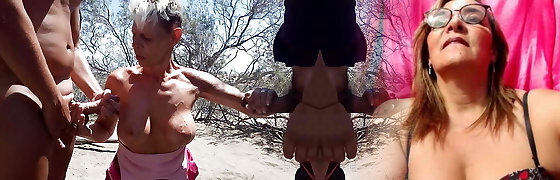 Skinny blonde cougar fucks on a nudist beach with two guys